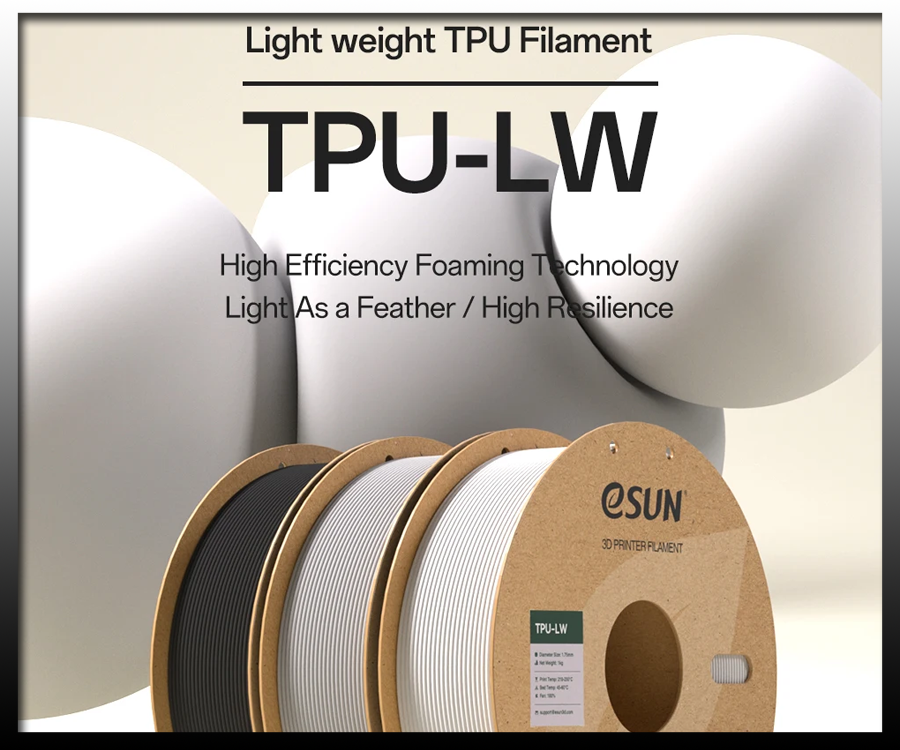 eSun TPU-LW (Lightweight Foaming TPU) Revolutionize your flexible prints with eSun’s Active Foaming Technology. Available in Black, Grey, and White on plastic reels.