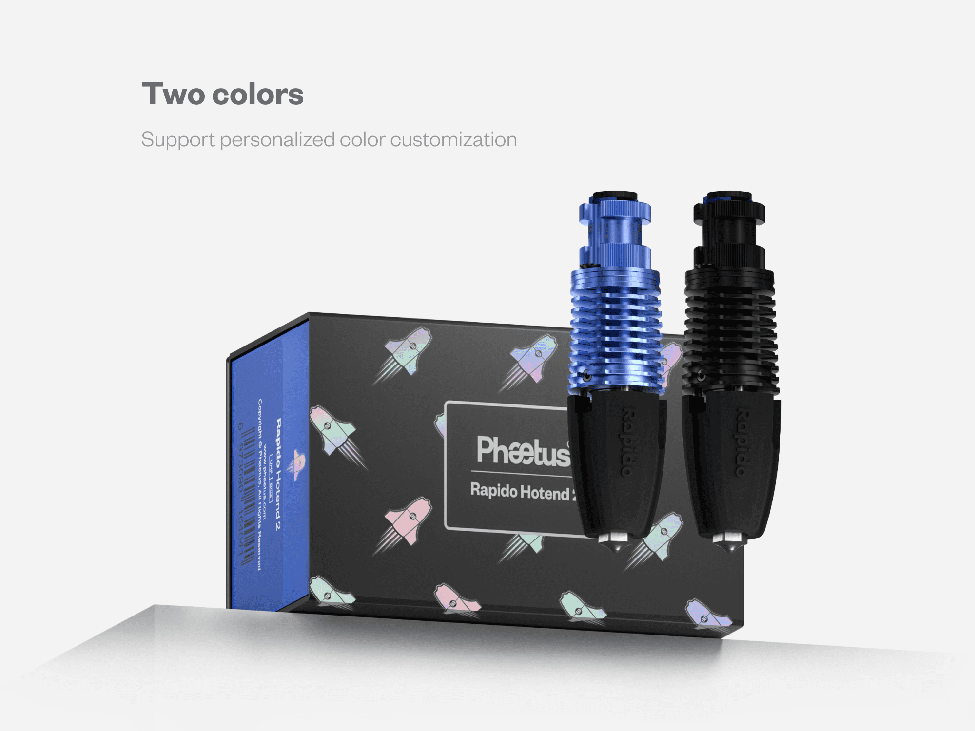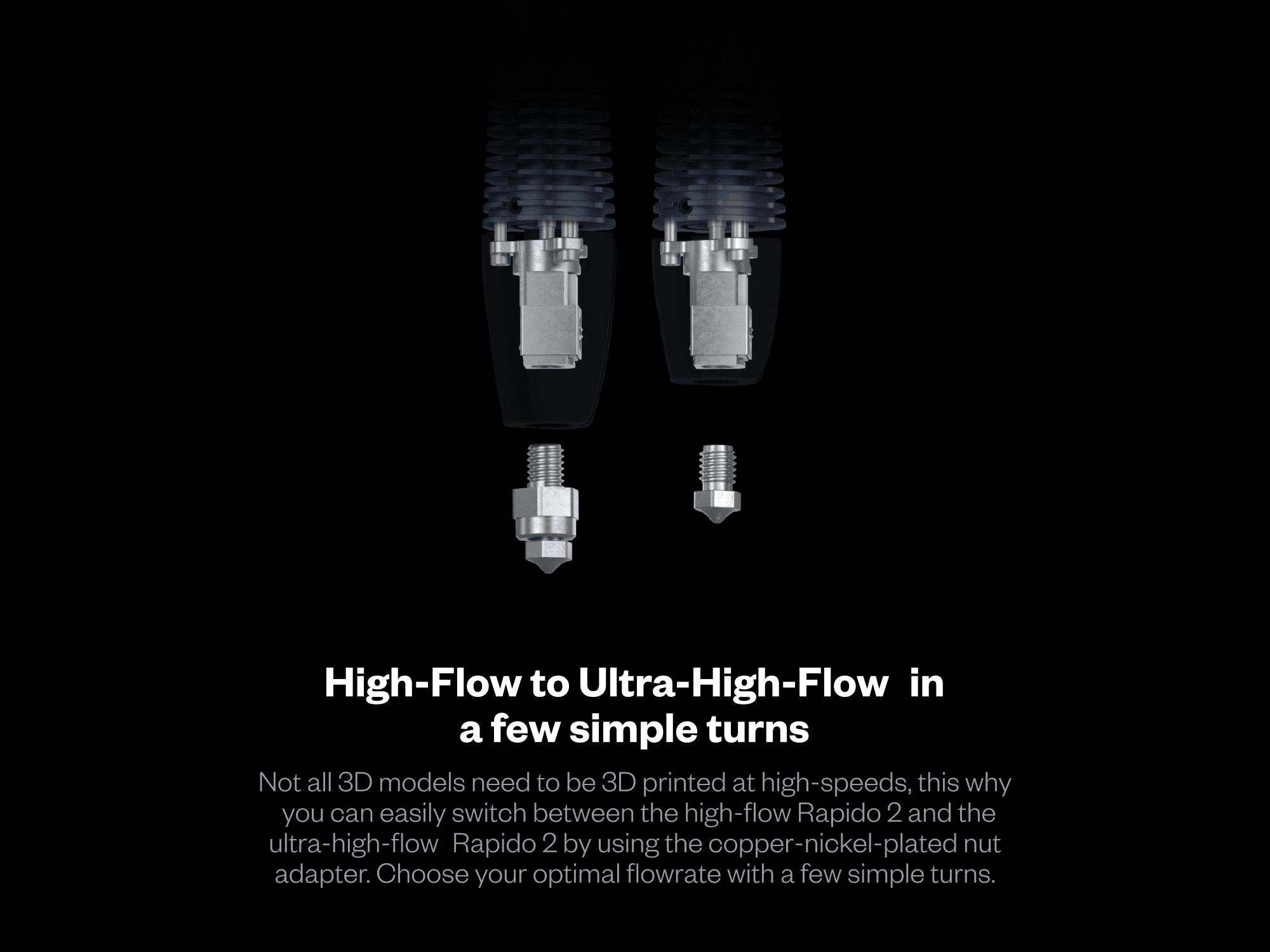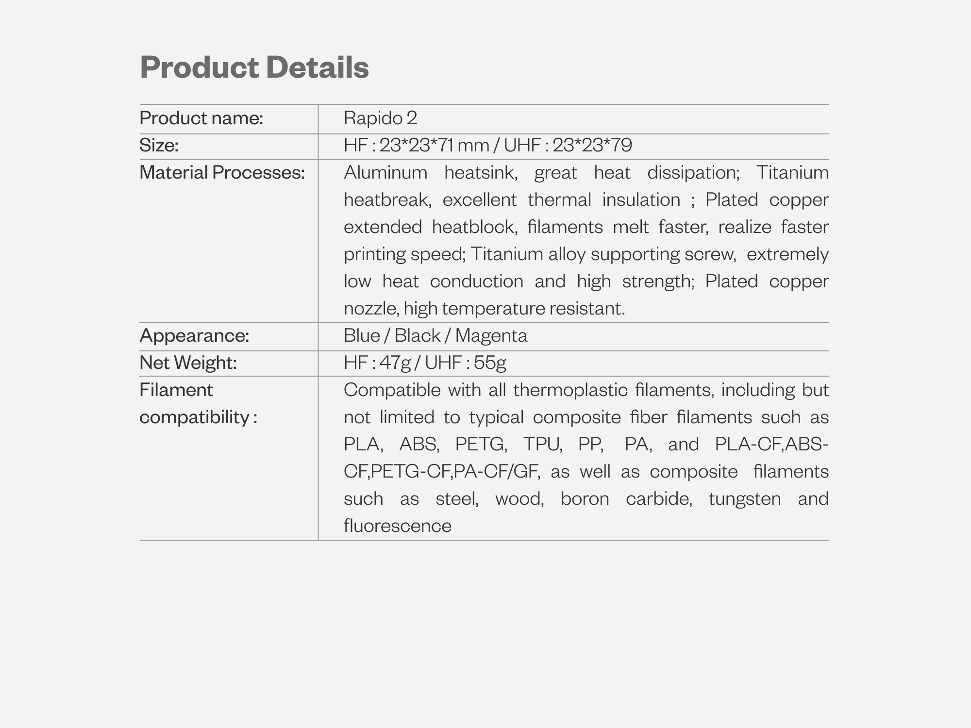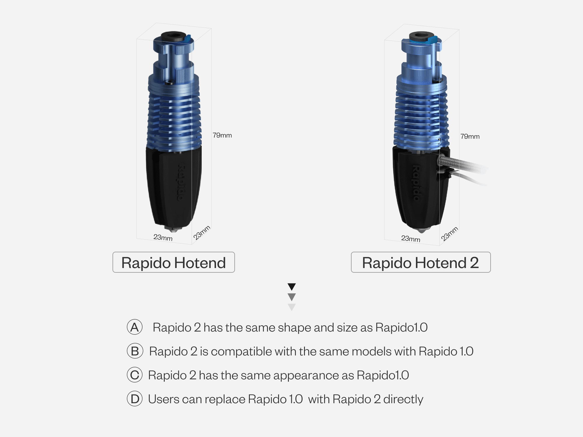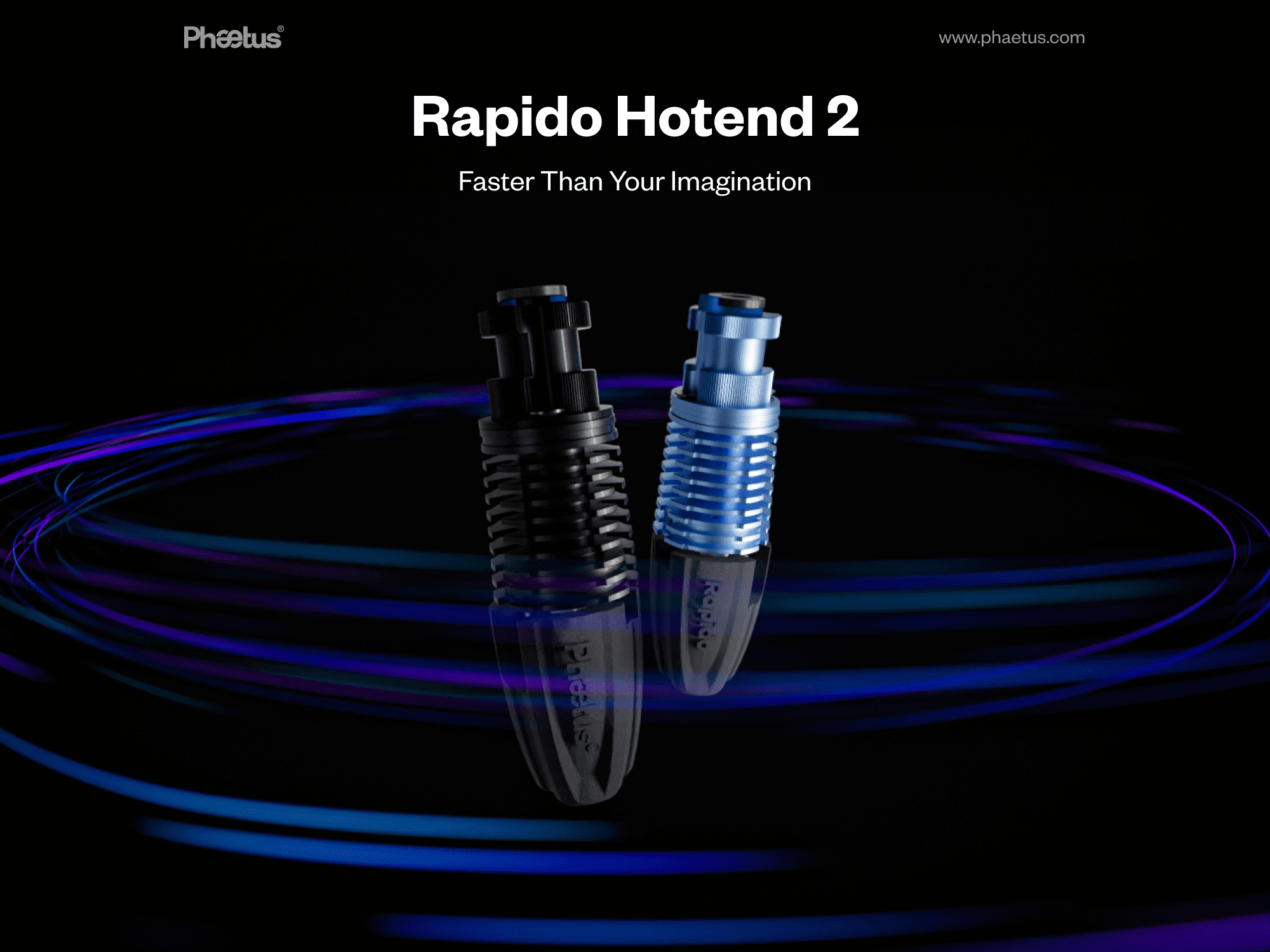 - Rapido HF (High Flow):The HF version of the Rapido Hotend is equipped with a V6 nozzle and the new V2 version is now being sent out.