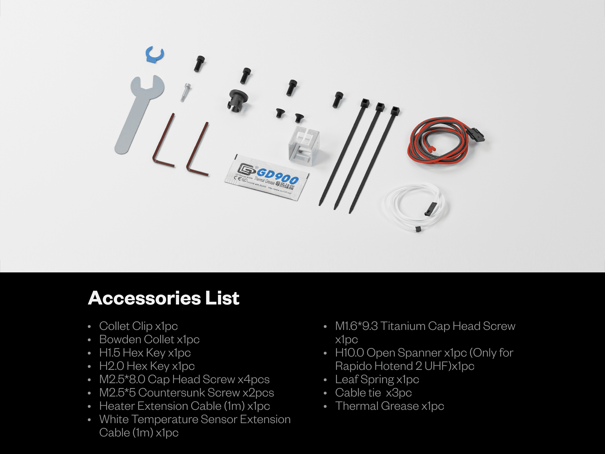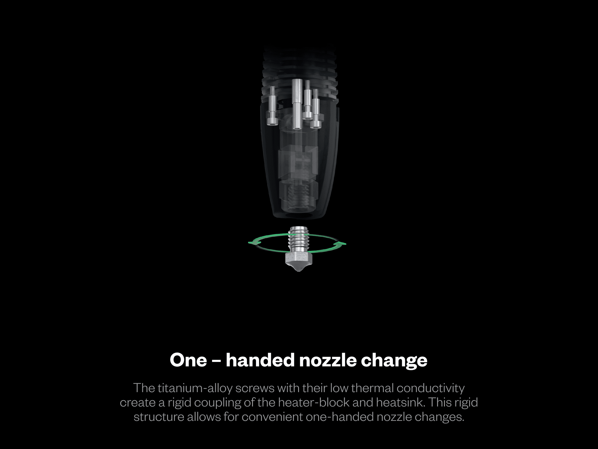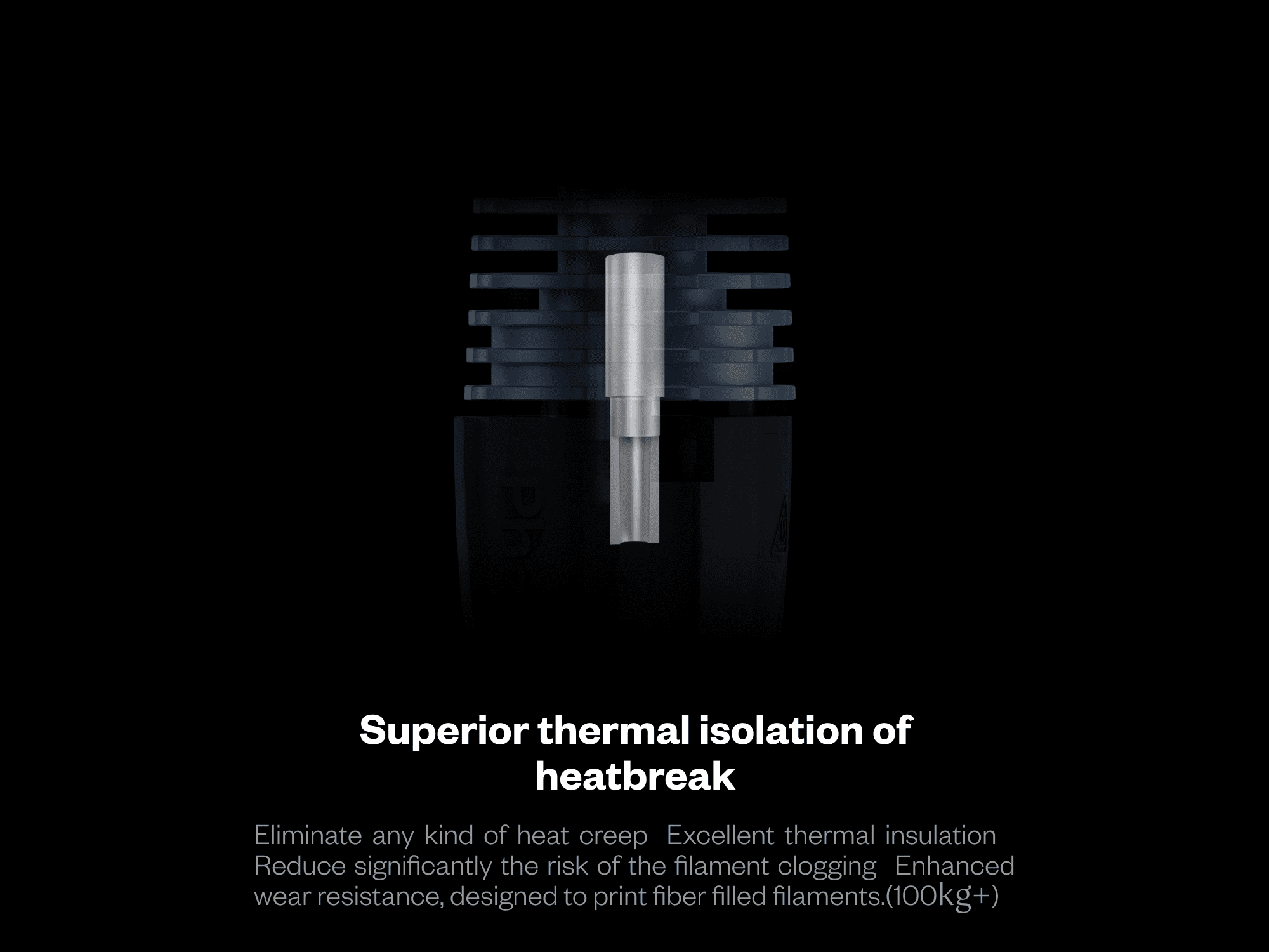 New heatblock design features a larger melt zone to suit the demands of high speed and high temperature printing with evenly heated thanks to cylindrical ceramic heating unit. Featuring an integral frame with a rigid structure of titanium alloy screws to create lower heat conductivity and realize the function of one-handed nozzle change.