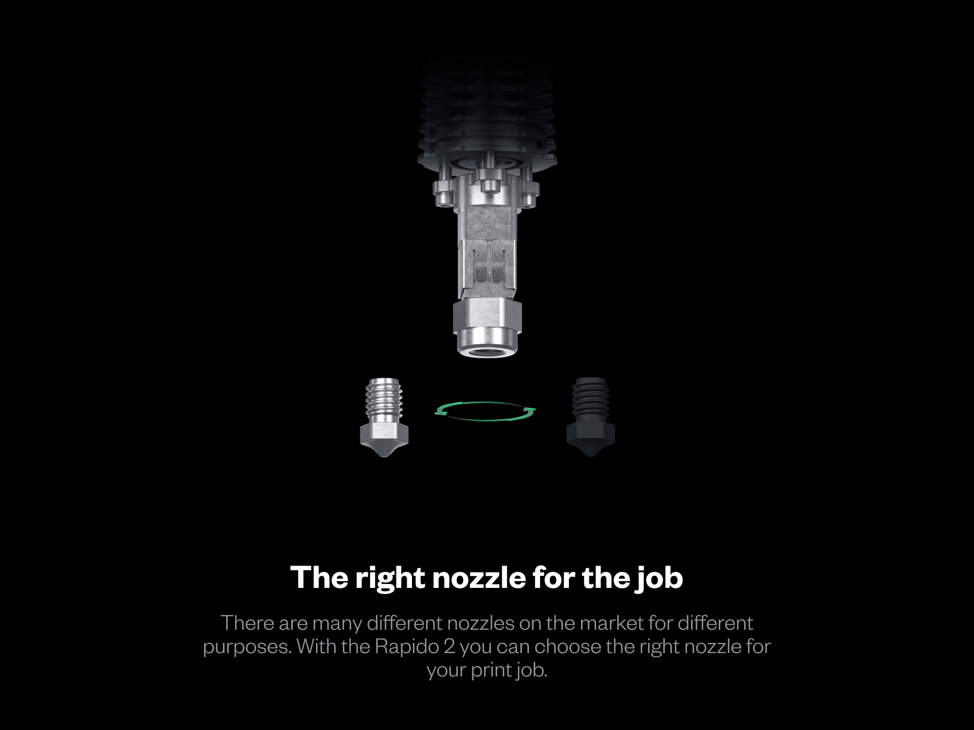 Note: Both hotends can be used with the V6 and Volcano nozzle. To use the Volcano nozzle on the Rapido HF Hotend, however, a separate adapter is required, which is included in the Rapido Upgrade Kit.
